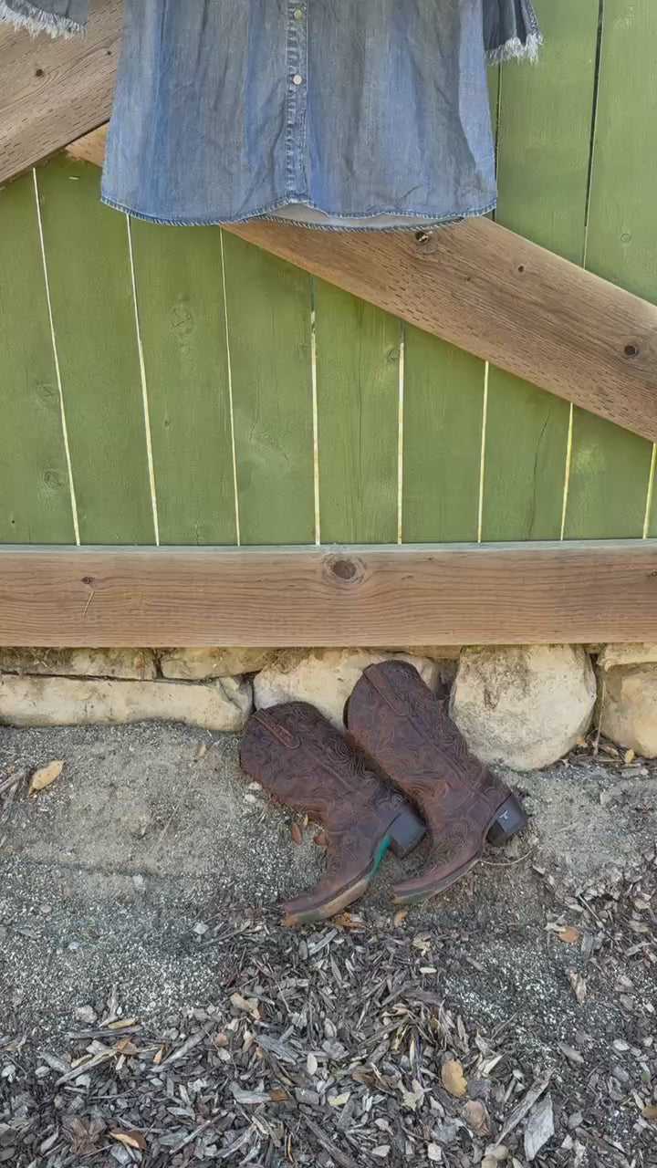 This dress takes a classic jean shirt dress and gives it a modern twist with soft bell sleeves and subtle western detailing. Made from washed denim with just the right structure, it's the perfect mix of rugged and refined and ready for boots, sandals or bare feet.