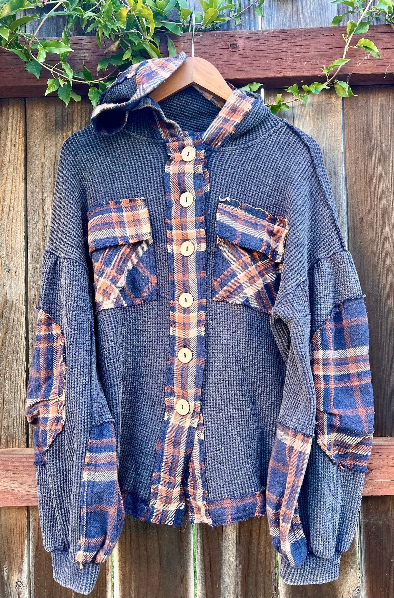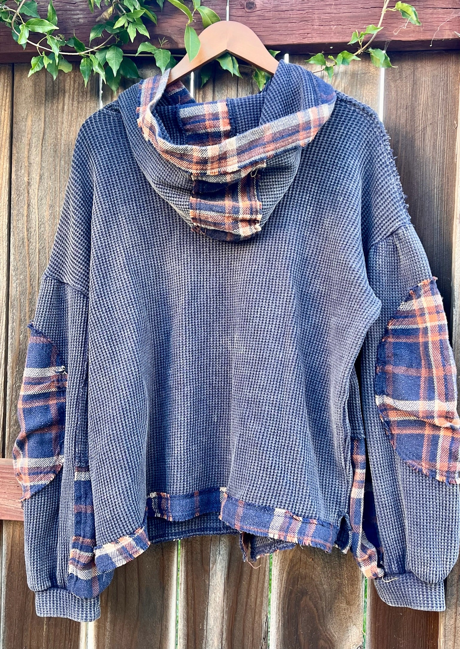 This cozy hoodie blends a charcoal waffle knit body with vintage inspired plaid patchwork for that perfectly broken in, everyday adventure look. Thoughtful raw seams, balloon sleeves, and soft wooden buttons add natural texture, while the mixed-fabric design keeps it unique and effortless.